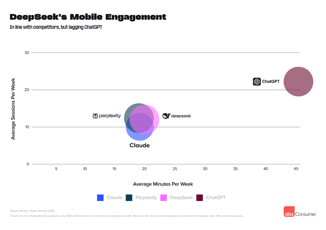 根据 Sensor Tower 的数据,DeepSeek 用户在移动设备上的参与度略高于Perplexity 和 Claude 用户,这是基于平均每周每位用户的会话数和每位用户的分钟数。然而,参与度仍然远远落后于 ChatGPT。