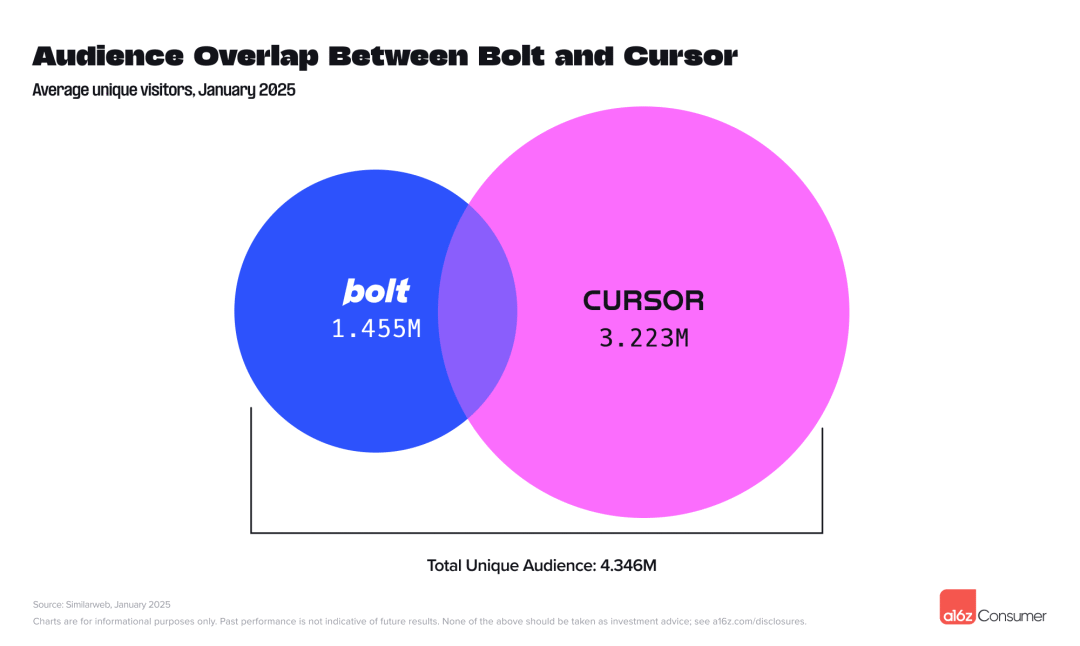 根据 Similarweb 的数据,2025 年 1 月,Bolt 的 23% 独立访客也访问了 Cursor。