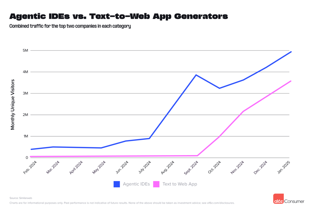 就每月网页独立访客(而非访问量)而言,排名前两位的 Agentic IDE 目前超过了排名前两位的文本转网页应用构建器,尽管这两个类别的增长速度相似。我们很想知道这种情况会如何发展。