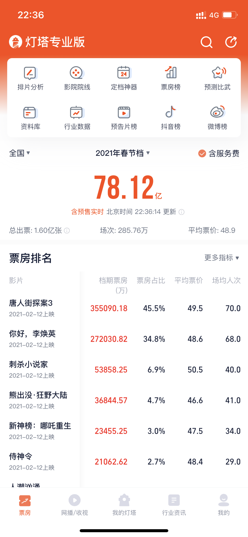 @新京报【 2021 春节档票房超 78 亿收官!票房、观影人次双双创纪录】根据灯塔专业版实时数据,截至 2 月 17 日 22 时,2021 年春节档总票房累计超 78 亿,总观影人次 1.6 亿,累计场次 285.8 万,创中国影史春节档累计票房、人次新纪录。《唐人街探案3》成为档期内的冠军,单片方面票房前三名为《唐人街探案3》35.5 亿、《你好,李焕英》27.2 亿、《刺杀小说家》5.4 亿。
