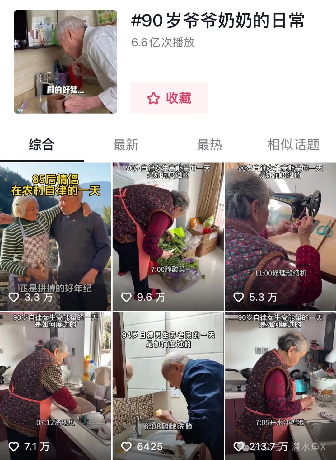 短视频最近的新鲜事:“二旬老人”每天半死不活刷‘梅英阿嬷’,看90岁自律女生高能量如何度过一天”。