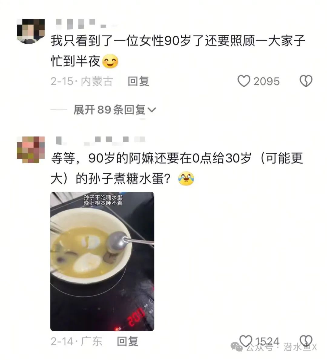 从账号内容来看,几乎没有任何家庭成员帮助过梅英做家务,并且这些晚辈也不太好伺候:孙子晚上不吃糖水蛋睡不着觉,一家人吃面条,梅英得准备三种不同的面,一拨人吃普通挂面,曾孙女吃黄色的碱水面,曾孙子要吃绿色的蔬菜面。小孩难搞也算了,按梅英90岁,出镜的曾孙女五六岁计算,孙子怎么也有快30岁了,凌晨让奶奶给自己煮糖水蛋助眠,你想过奶奶的睡眠和健康吗?