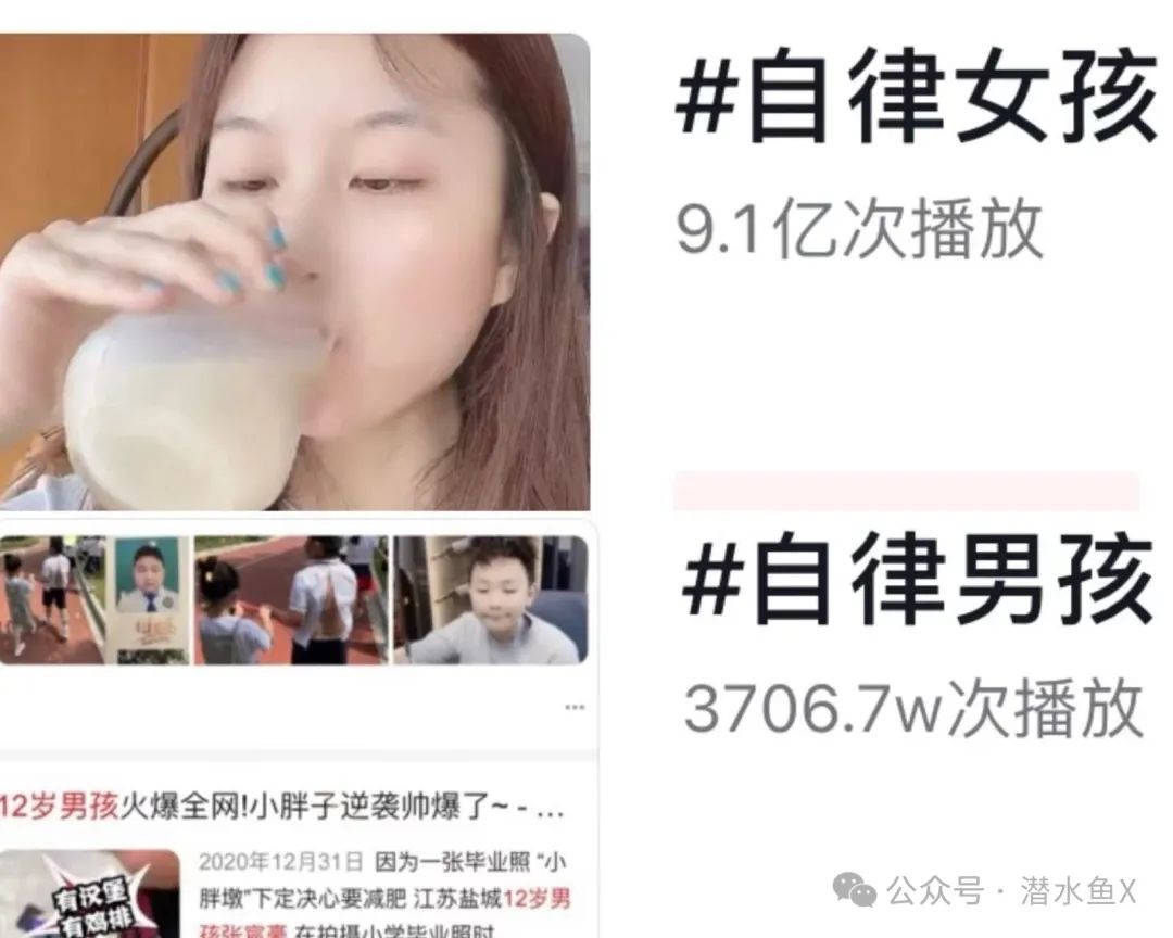 然而和职场加班陷阱不同,自律陷阱往往面向女性而设置,对男性免疫。不同年龄段、不同国别,女性用户生产的自律vlog远比男性多,在抖音上,#自律女孩#话题有9.1亿次播放,而#自律男孩#只有3700万次播放。
