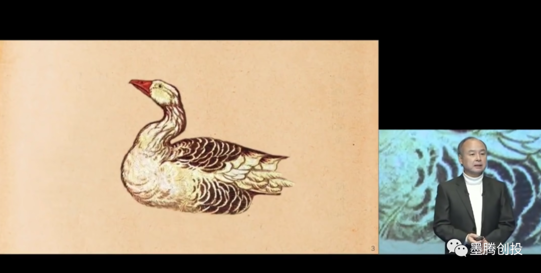 不过,有朋友注意到,在发布会上,孙正义的第一张PPT就只是一只……鹅么?