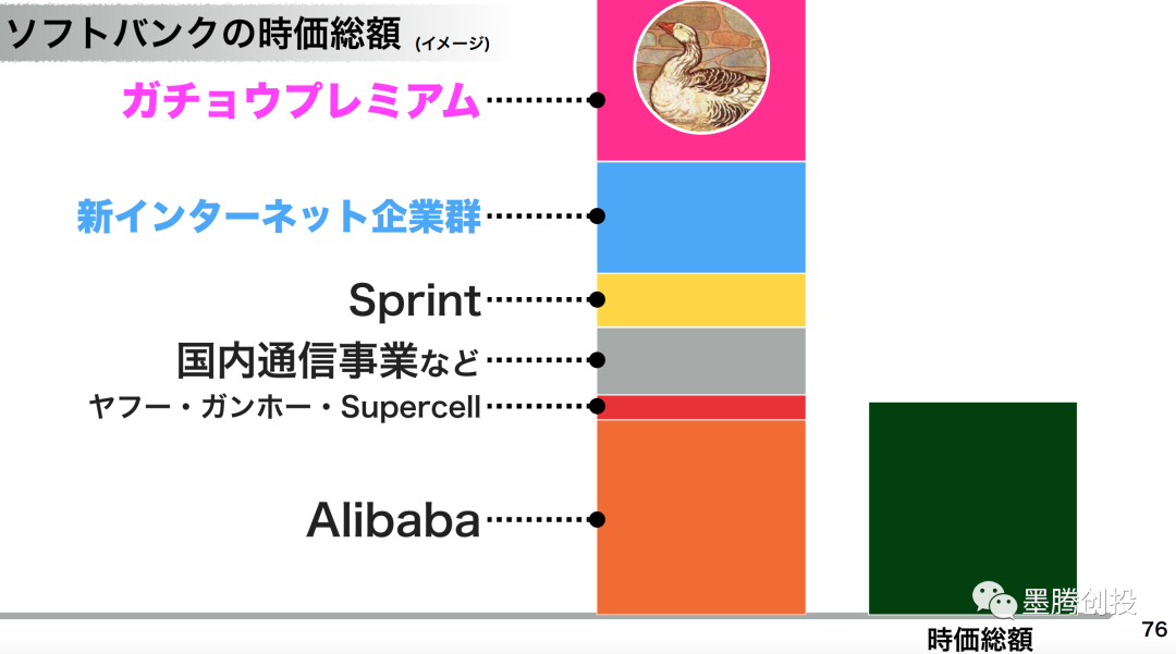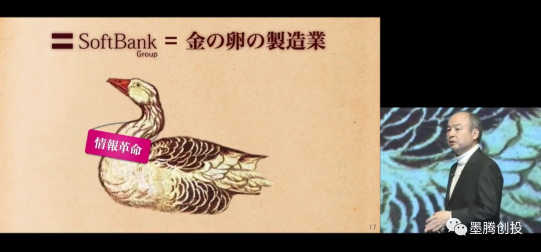 当时他说 “软银是一只肚子里有很多金蛋的鹅,尽管有时候这些蛋还没有成熟。” 当时说这个的意思是软银的市值其实是远低于所有金蛋加起来的。