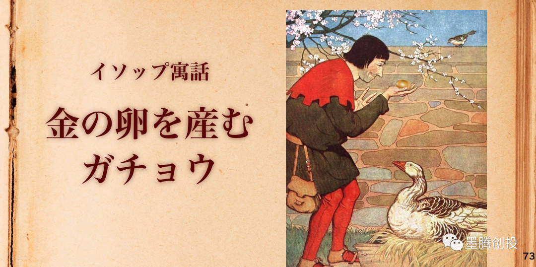 其实,这不是孙正义第一次把软银比做下金蛋的鹅。早在2014年第二季度的财报会上,孙正义就引用了最早出自伊索寓言的金蛋鹅: