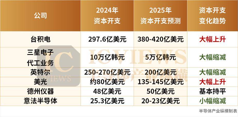 这也意味着,半导体周期的起伏将直接左右这些公司接下来的发展规划。也正因此,上表中的三星电子虽占据小部分的先进制程芯片市场,但依旧难逃市场冲击,大幅下调2025年的资本开支。