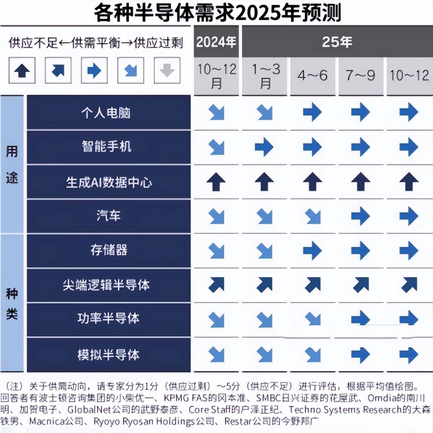 关于2025年的半导体供需情况,专家按照类型和用途分季度从供应过剩到供应不足5个等级进行了评估。回答来自调研公司、分析师及专业商社等11家机构。