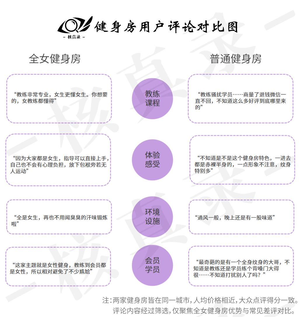 (注:为了更好地明确女性对健身房的个性化需求以及全女空间在这方面的优势,我们特意将全女健身房的好评与普通健身房对应角度的差评进行比较,并不代表普通健身房普遍存在差评中的问题。)