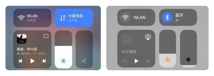 从控制中心布局来看,许多手机品牌的控制中心都采用了类似的布局。从下图我们可以看出,所展示的四家厂商中的控制中心上半部分都含有音乐控制区块、亮度控制区块、音量控制区块和网络控制区块。