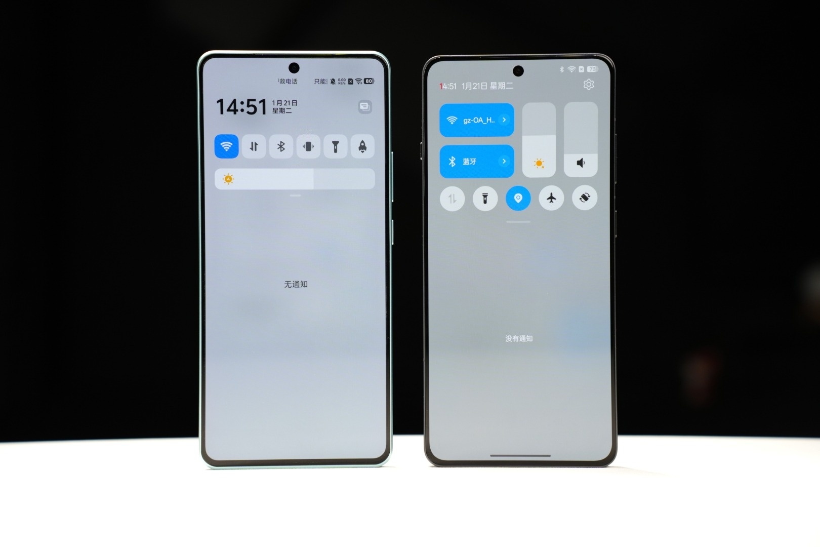 经典单页式控制中心(左OriginOS 5,右ColorOS 15)