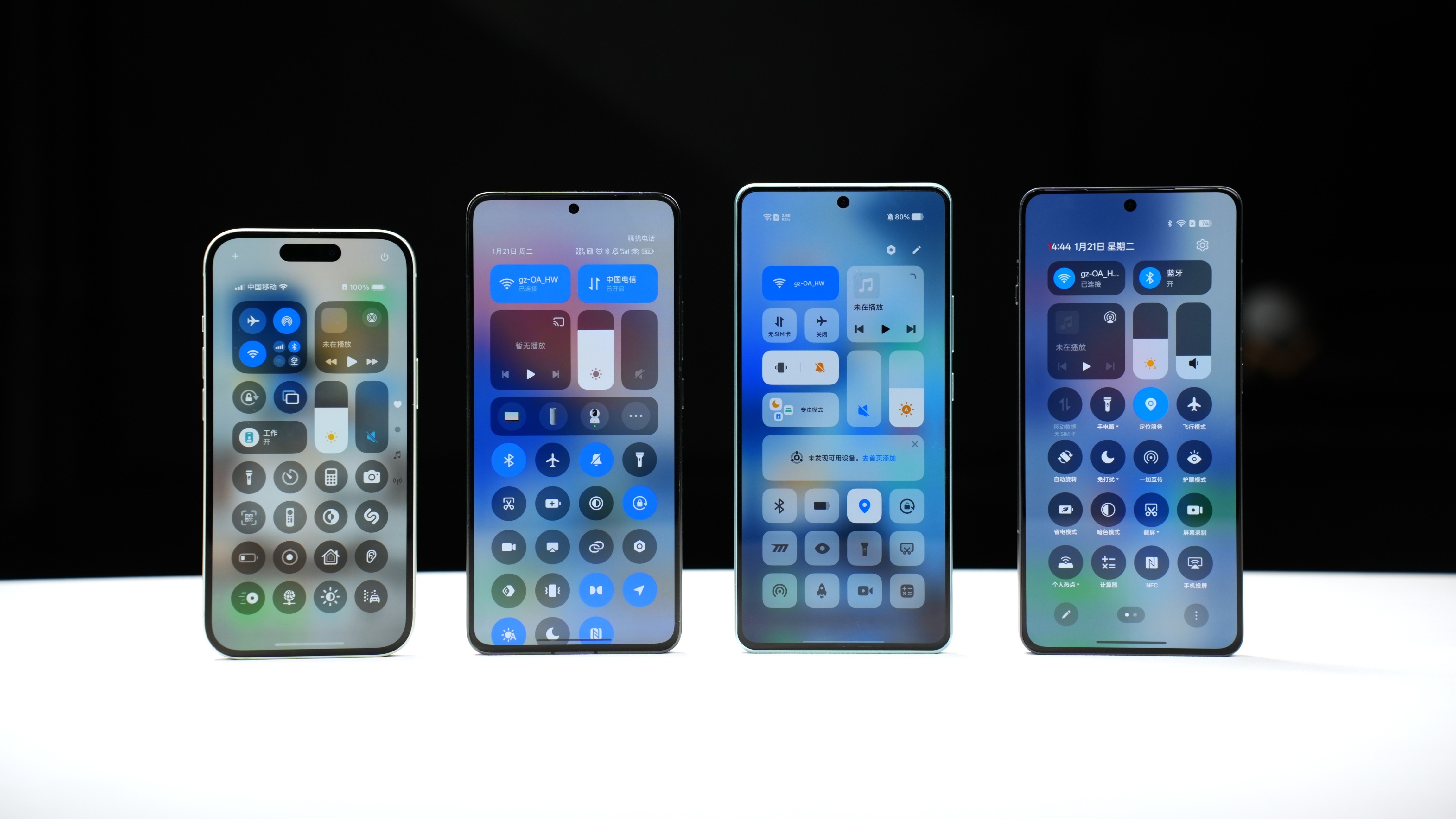 (左一为iOS 18,左二为ColorOS 15,右二为HyperOS 2,右一为OriginOS 5)