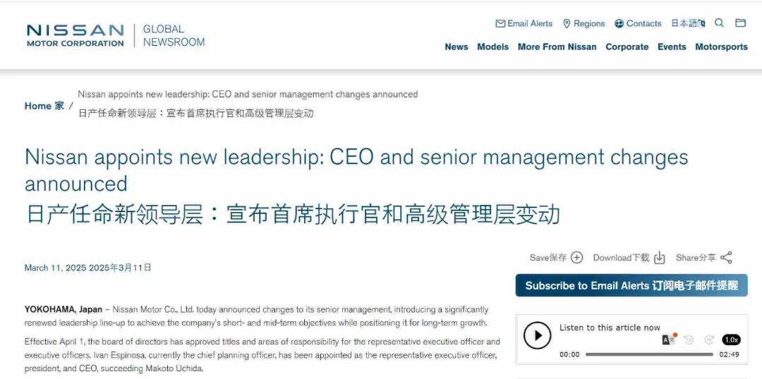 3月11日,日产汽车在其官网发布重磅消息称,公司董事会当日召开会议,决定现任CEO内田诚将于3月底卸任,自4月1日起,由公司首席规划官伊万·埃斯皮诺萨(Ivan Espinosa)接任。