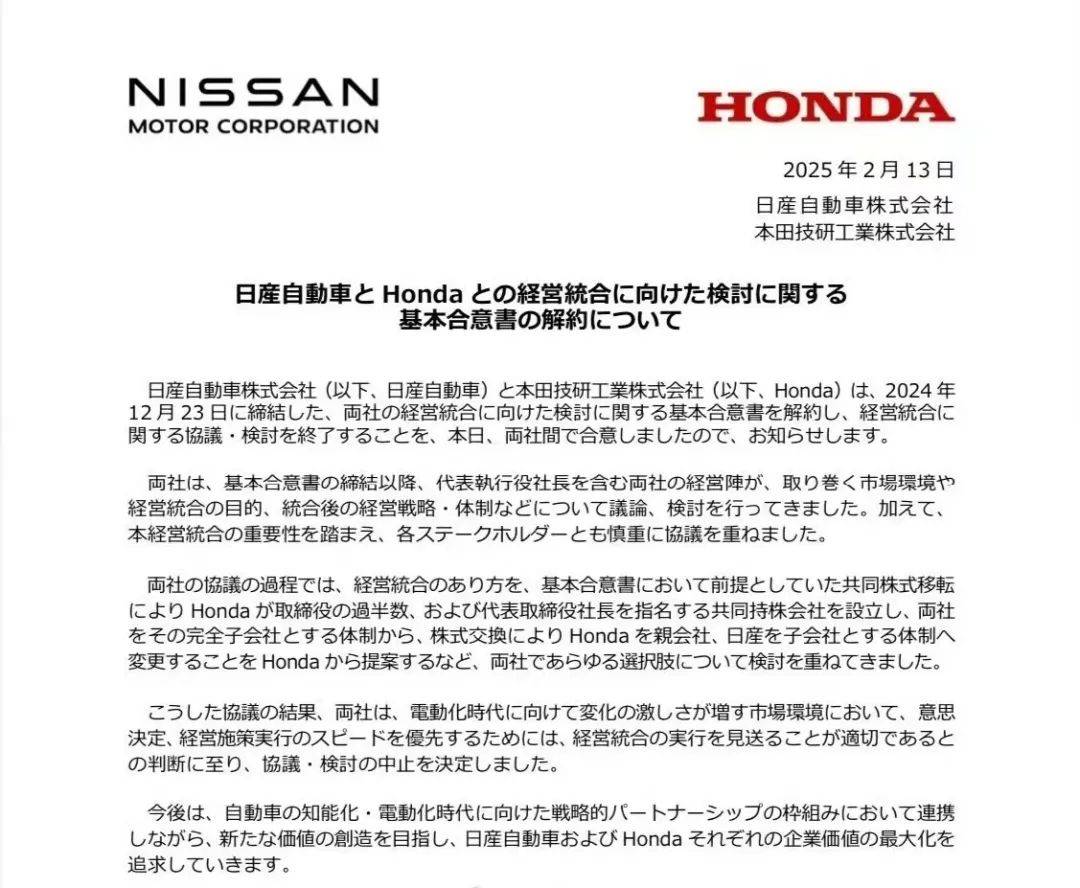 不过,在今年2月,双方合并计划生变,本田与日产官方宣布,决定撤回双方于2024年12月23日签署的谅解备忘录,并终止经营合并谈判。同时,与三菱汽车签署的有关三家公司合作的谅解备忘录也被终止。