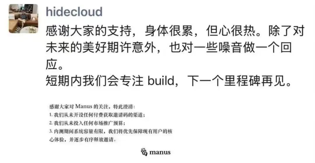 相比其他问题,我更关注什么时候能够用上Manus,我说的不是邀请码,而是很多人质疑,这一波“营销”过后,Manus的真正发布可能遥遥无期。