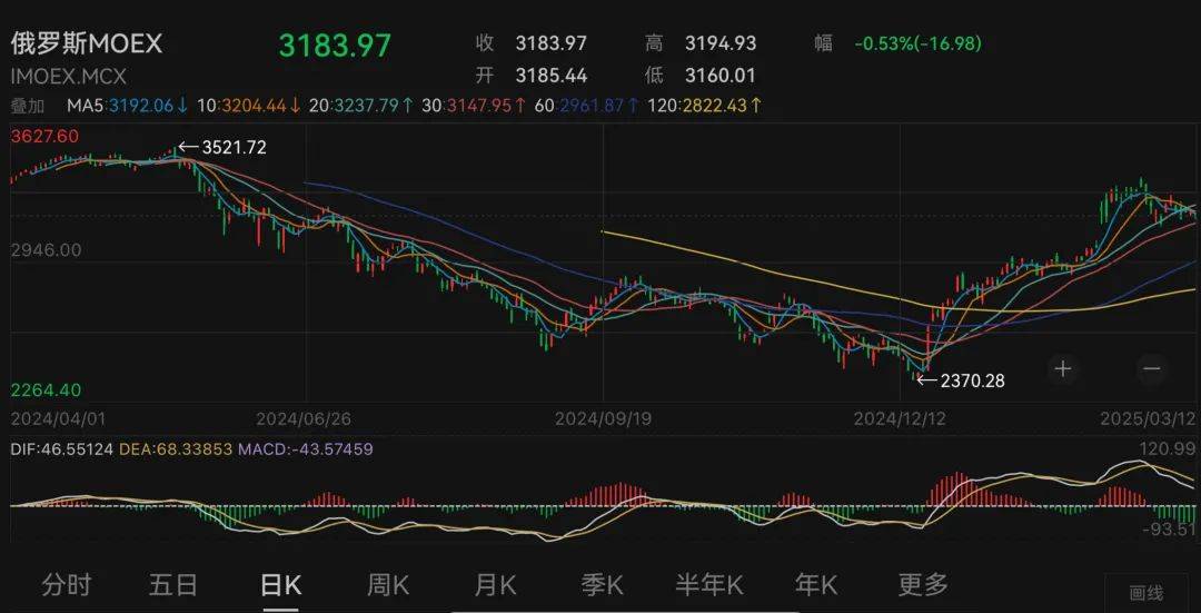 俄罗斯股指在今年也表现不俗。俄罗斯MOEX指数自2024年12月低点累计上涨31%,能源和矿业板块领涨。反弹既源于俄乌冲突缓和的预期,也得益于俄罗斯战时经济模式下国防开支的激增。