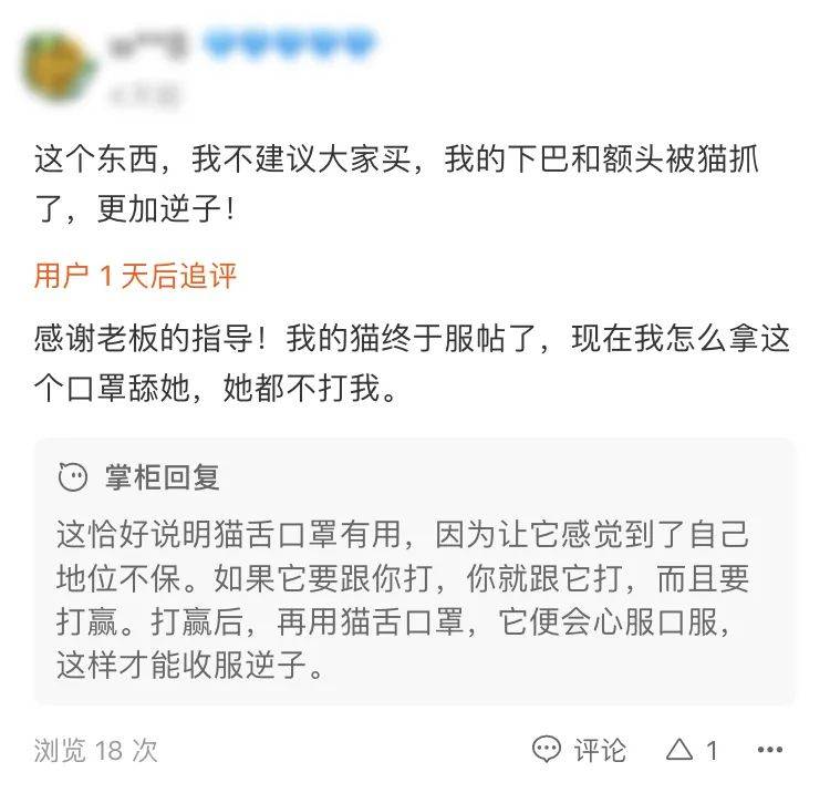 有人抱怨口罩只是愈加激发了猫仔的叛逆心,商家却回复“棍棒底下出孝子”,想树立家长权威,那还得跟猫“干一架”。谁能想到,一天后,收服逆子的买家真香了。