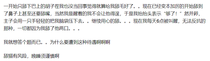 根据知乎答主@EvilP的哭诉,一只原本陪睡陪摸陪起床的三陪好主子,经过反舔的历练之后,突然习气大变,开始每天清晨六点舔脸,令他欲哭无泪。可以说是舔猫激活了叫早服务,“舔猫有风险,晚睡需谨慎”。