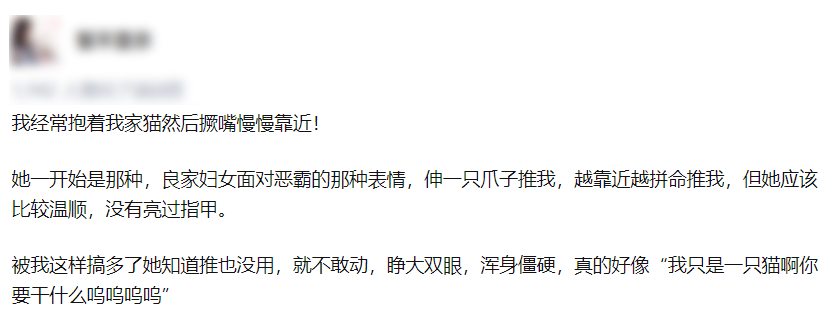 看似滑稽的举动有时也是危险的信号,轻则导致猫对你敬而远之,严重的还可能引起猫应激反应(僵直、自闭其实都意味着猫猫受到了惊吓),正所谓舔猫舔到最后一无所有……