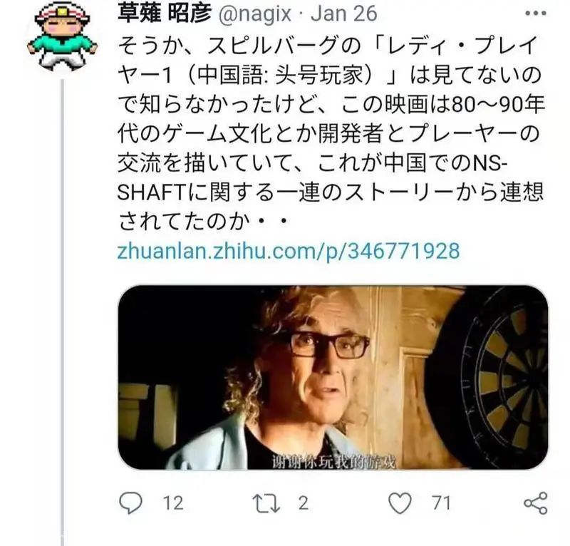 在“探索真相”过程中,假期贩子联系到游戏原作者草薙昭彦,后者在视频发布后,专程向假期贩子表示感谢。玩家和游戏制作者之间的亲切互动让网友们联想到电影《头号玩家》,于是,他们给假期贩子奉上了“B站头号玩家”的称号。