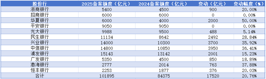 股份行方面,十二家股份行合计备案额度10.19万亿元,备案额度较去年增加1.75万亿元,增幅20.73%,占全部已披露备案额度的31.16%。其中,华夏银行增幅为50%,兴业银行、中信银行、渤海银行增幅均超30%。