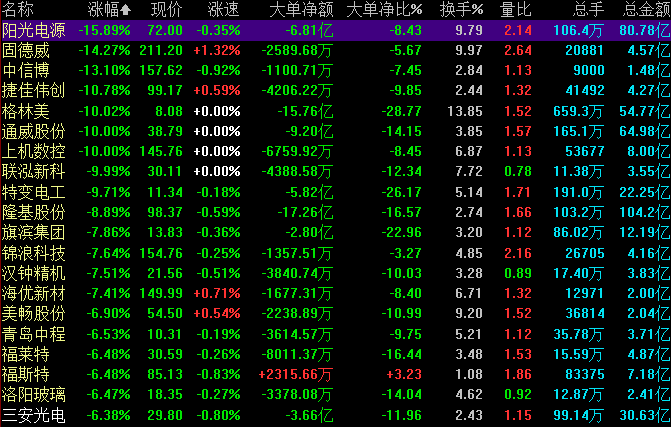 昨日光伏龙头通威股份大跌一事持续发酵,恐慌情绪延伸至整个光伏板块,硅料、硅片、电池、组件乃至光伏玻璃等均未能幸免。其中,阳光电源跌超15%,固德威跌超14%,隆基股份跌近9%,多只个股跌停。发生普跌的也不局限在光伏板块,风电板块同样受重挫。风电股龙源电力跌超8%,金风科技跌近5%。