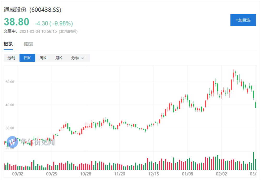 通威股份再次大跌,封死跌停,其股份较2月10日创出的55.5元历史峰值已跌超30%,两天市值蒸发362亿元。另外,通威股份全天成交97.5亿元,这一成交额为该股历史最高成交金额。