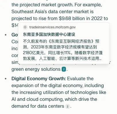 而作为Deep Research模式的基本操守,来源是必须有的。在ChatGPT的Deep Research中,会文内显示来源网站的域名。
