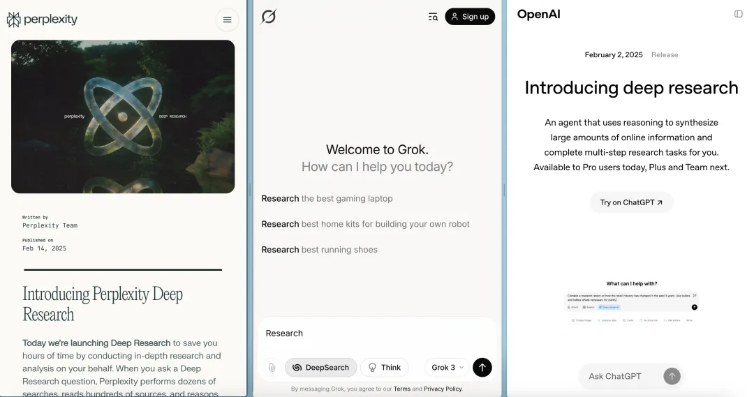 今年才过去三个月,主流的大模型厂商纷纷推出Deep Research服务。从OpenAI、DeepSeek,到刚推出不久的Grok 3,以及曾经的弄潮儿Perplexity,“深度研究”成了一时间,家家都在卷的功能。