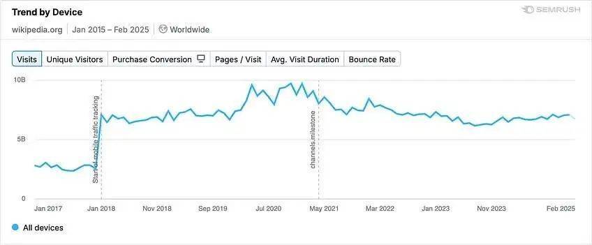 Semrush是一个监测网站的访问流量变化的平台,数字营销及SEO在调研中发现,Semrush统计显示,被认为最容易受到AI威胁的维基百科,流量实际上并没有如预期般走低。