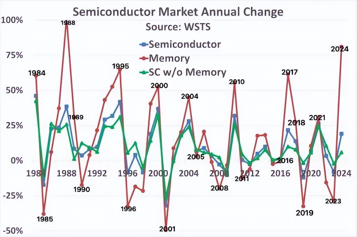图中针对半导体总量、存储器市场以及剔除存储器后的半导体市场进行了比较分析。可以清晰地看到,存储器市场呈现出极为剧烈的波动,曾有高达102%的增长幅度以及49%的下滑幅度等极端情况出现,而与之形成鲜明对比的是,不包含存储器的市场则表现得较为平稳,其波动区间处于增长42%至下滑26%之间。