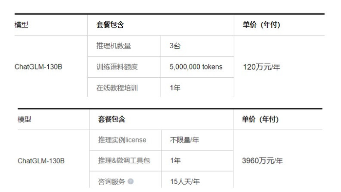 比如智谱就是类似的模式,其在官网披露了同款服务,虽然现在只写着千万和百万。不过,在2023年,智谱的商业版本部署价格大概如下。