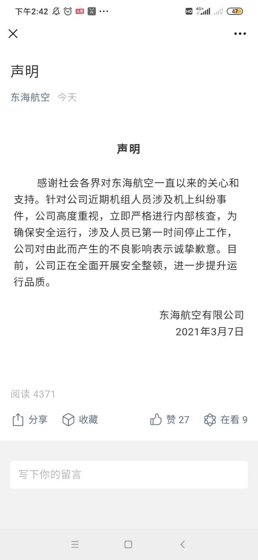3月7日,东海航空官方微博及微信发布声明显示,“感谢社会各界对东海航空一直以来的关心和支持。针对公司近期机组人员涉及机上纠纷事件,公司高度重视,立即严格进行内部核查,为确保安全运行,涉及人员已第一时间停止工作,公司对由此而产生的不良影响表示诚挚歉意。目前,公司正在全面开展安全整顿,进一步提升运行品质”。