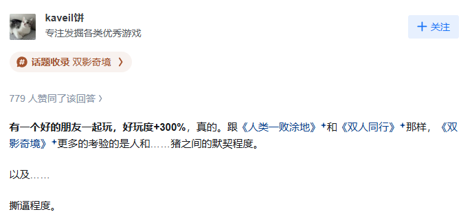 在知乎一则“如何评价双人合作游戏《双影奇境》”的问题下方,一则高赞回答提到,“有一个好的朋友一起玩,好玩度+300%。”游戏本体是不变的,但是游玩伙伴的适配程度,将极大地影响你的游戏体验,甚至于能够触达到多深的情感内核。