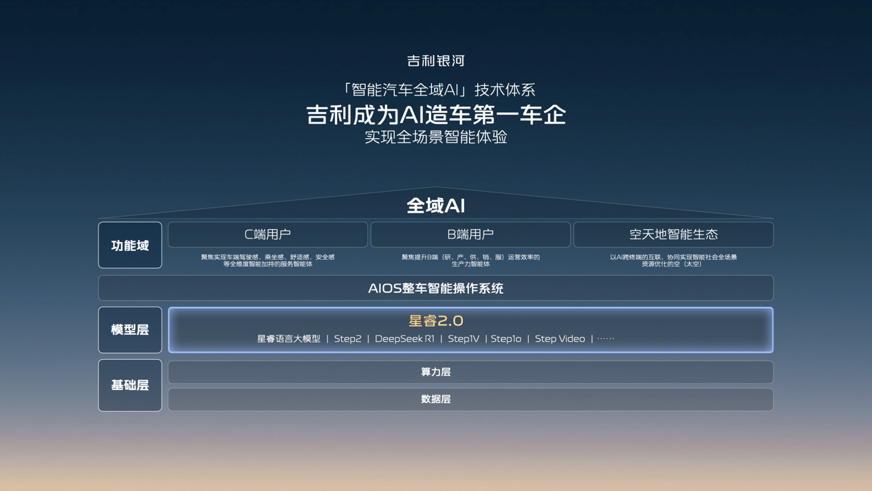 不止星睿AI大模型与DeepSeek-R1的深度融合,吉利还与阶跃星辰联合开源了两款阶跃Step系列多模态大模型,并与阶跃星辰、千里科技、星纪魅族等科技生态伙伴,成立了全球唯一的“智能汽车算力联盟”——星睿智算中心2.0,算力资源超越了万卡级别,综合算力提升到了23.5EFLOPS,成为中国车企算力第一。吉利正构建从“精准意图理解”到“全场景服务闭环”的智能生态,其技术路径不仅涵盖座舱交互革新,更延伸至企业级AI服务与空天地一体化生态建设。
