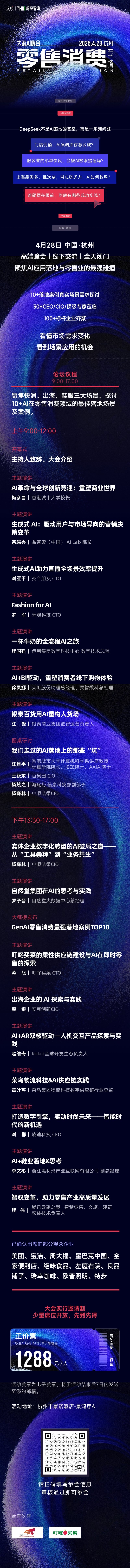 4月28日,杭州,线下高端峰会,全天闭门,聚焦AI应用落地与零售业的最强碰撞。