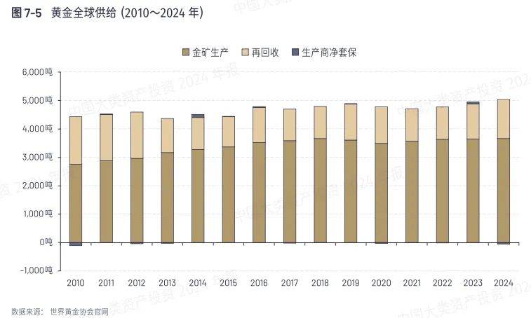 供需分析可能帮助我们分析未来黄金的走向。黄金的供给端相对比较稳定,80%来源于开采和冶炼,20%来源于旧金属电子元器件回收再利用。而占大头的开采和冶炼由于从获得开采许可到实际开采的周期特别长,这也使得黄金的供给很难在短时间内发生变化。2010年后,全球黄金供给量稳定在4500-5000吨左右。
