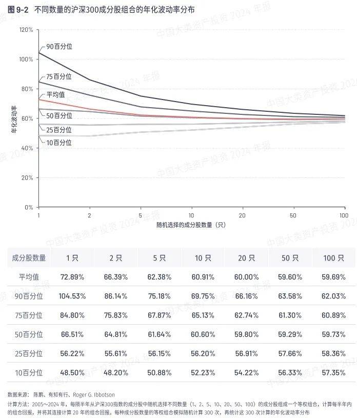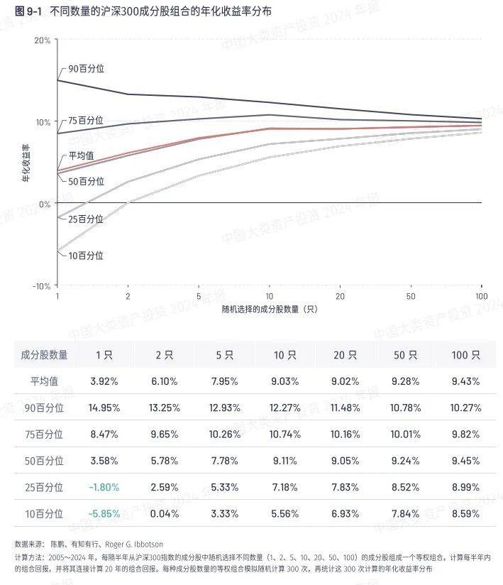以A股为例,年报中做了一个很有意思的测试,2005年至2024年每隔半年,从沪深300指数的成分股中,随机选择不同数量的成分股(1、2、5、10、20、50、100)组成一个等权组合,计算每半年内的组合回报,并将其滚动20年计算组合总回报。