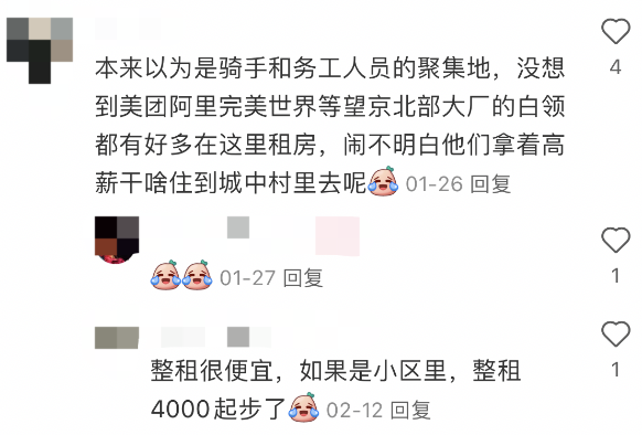 但最近,随着大厂向五环外搬迁,一些随公司而居的大厂人,到公司所在的善各庄、崔各庄附近一看,开始慌了:“大厂的写字楼附近,前面是村,后面也是村,住过来基本等于被精致白领图鉴除名了。”