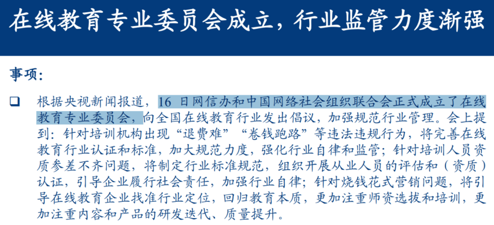 3月16日网信办和中国网络社会组织联合会成立“在线教育专业委员会”。针对培训机构“退费难”和“卷钱跑路”等违法行为,针对培训人员资质参差不齐,针对烧钱花式营销问题展开监管。