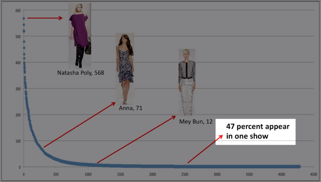 我们利用Style.com这个网站,追踪了为不同设计师工作的模特群体。你们能看到,这里呈现出了非常经典的幂律分布。这在赢者通吃的体系里非常典型。
