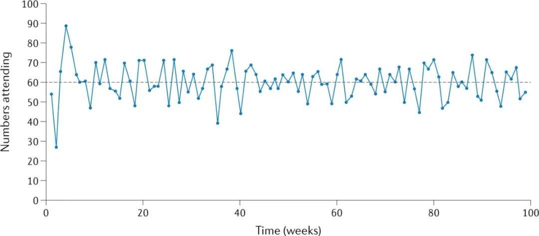 在El Farol的情况下,计算实验表明(图1),酒吧的出勤率(以及正在采取的预测的收集)会自组织成一个平衡的模式,徘徊在舒适的60水平附近。原因是,如果长期来看少于60个,低值预测(low forecastes)将是有效的,因此会有很多人会来,从而否定这些预测;如果长远预测很多人会来,那么很少的人会在场出现。