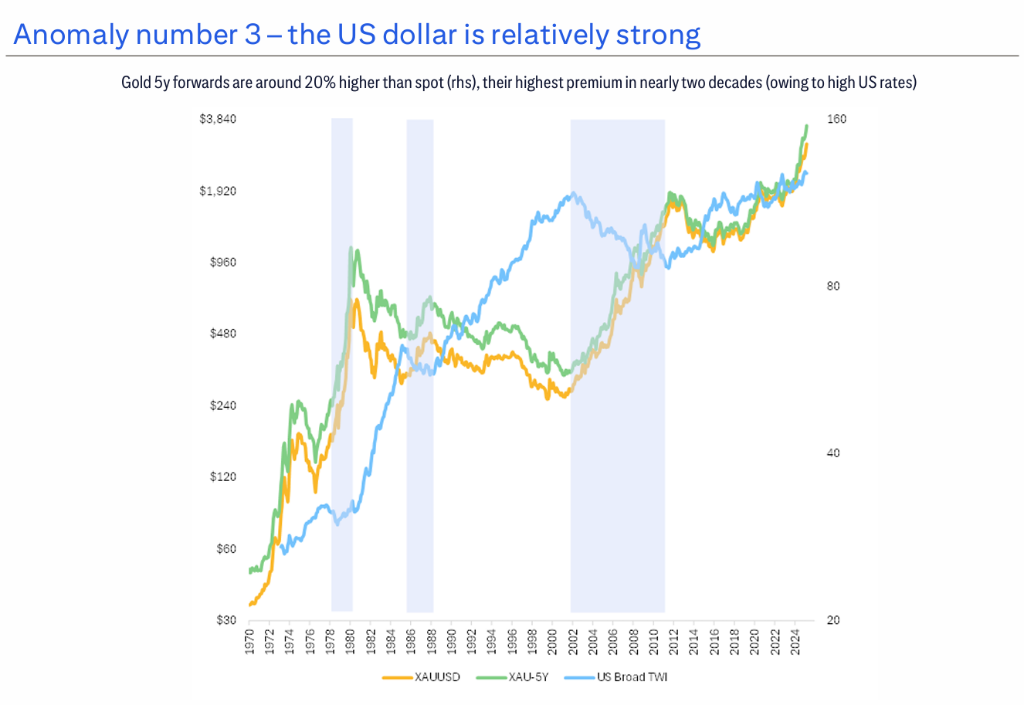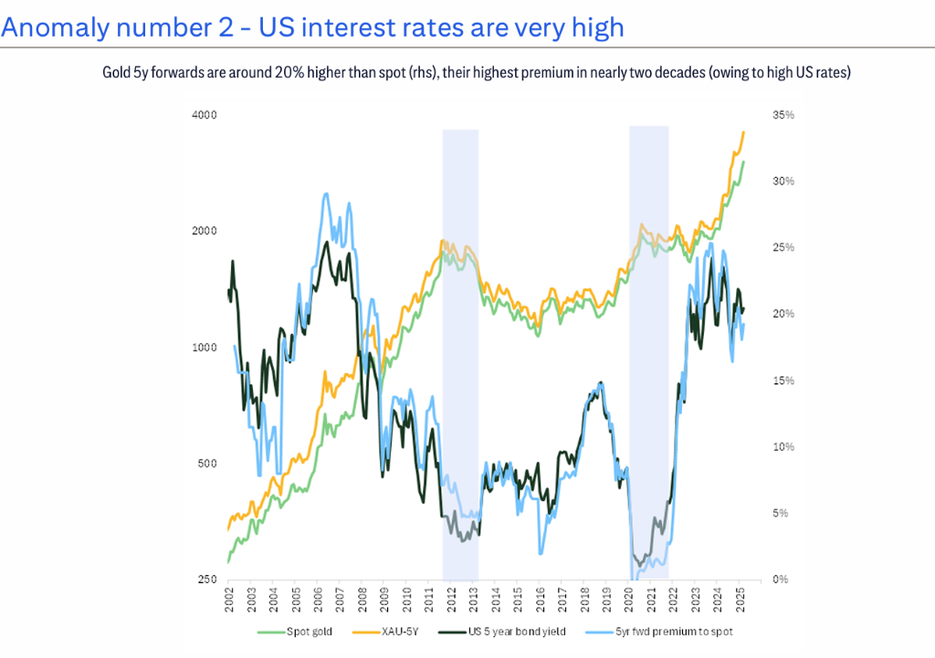 现货价格处于历史高位。 报告指出,黄金5年远期价格比现货价格高出约20% (右侧),是近二十年来最高的溢价,这主要是由于高企的美国利率造成的。