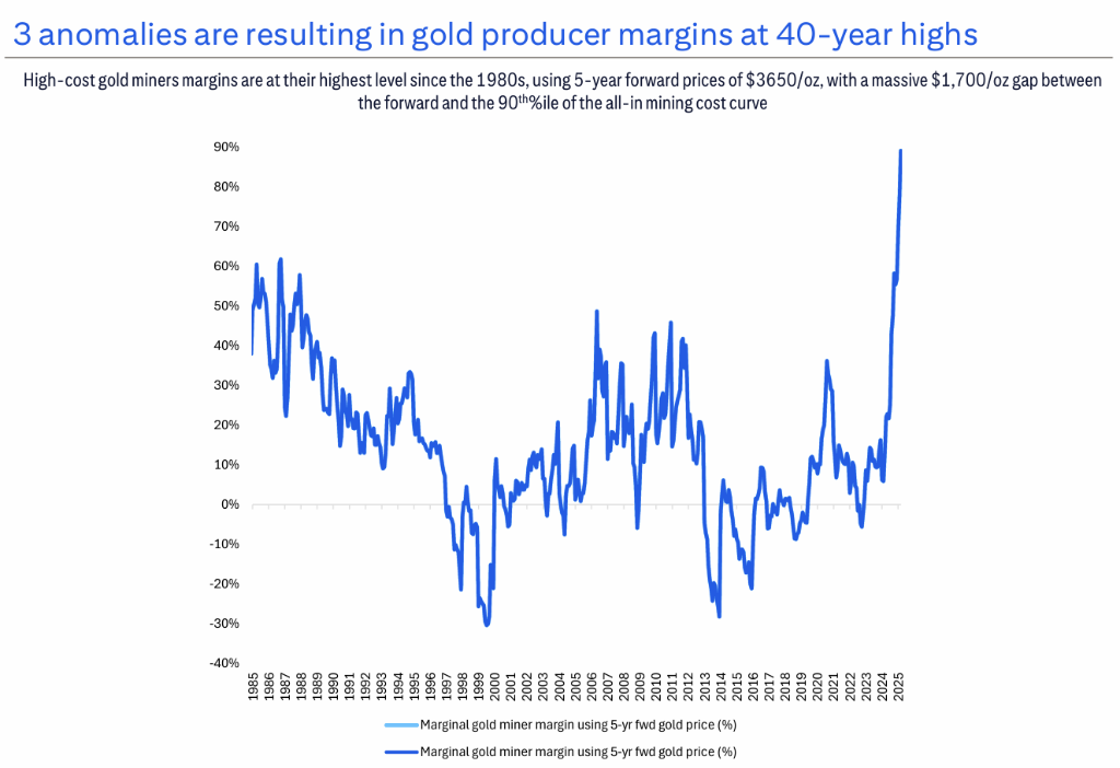 使用5年远期价格计算,黄金生产商的边际利润率达到40年来的最高水平,这为生产商提供了巨大的利润空间。