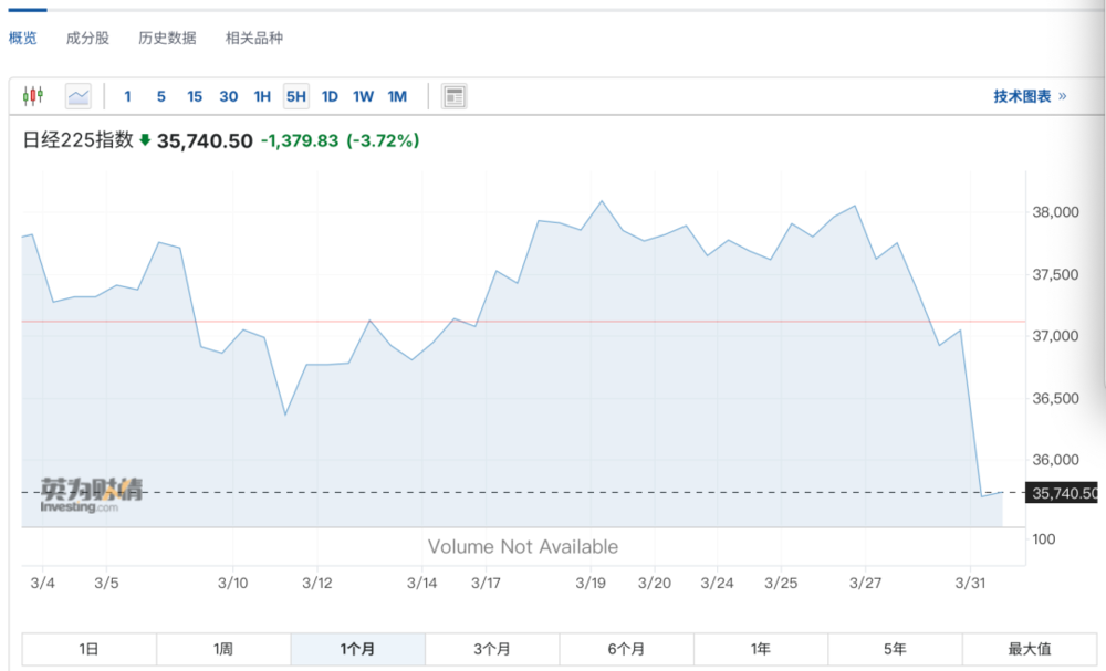 下面这张图显示,从3月28日开始,也就是最新的两个交易日,日经225指数无法扛住重压,断崖式下跌。