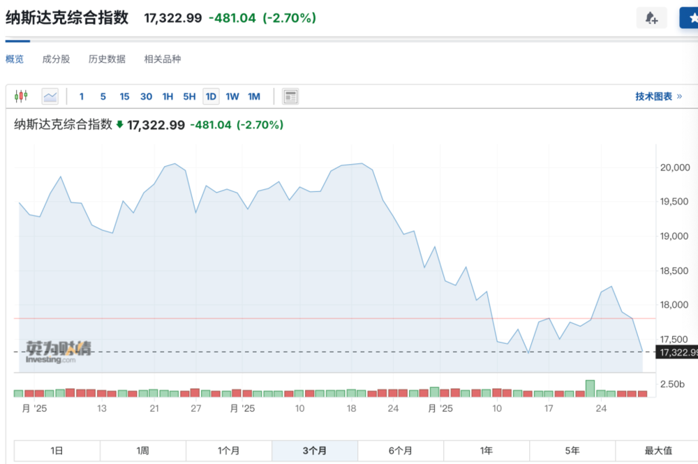 据FX168分析,3月28日美股受到强烈打击,三大股指集体大幅收跌。标普500指数或将出现六个季度以来的首次季度下跌,而以科技为中心的纳斯达克指数将出现自2022年以来的最大季度跌幅。
