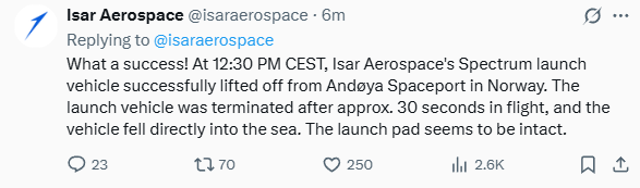 伊萨尔发布的情况说明,开头便是What a success! (多成功啊!)这就有点让人难绷。火箭没搞定,“赢学”倒信手拈来。