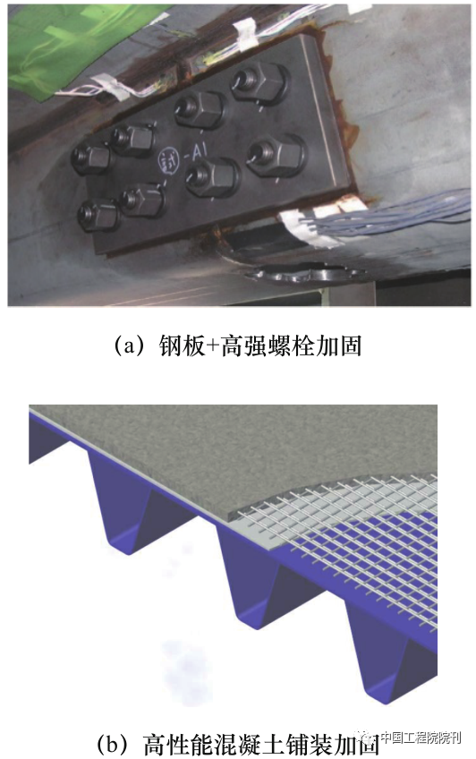 面对自然灾害、人为破坏造成的结构损伤以及设计、施工中产生的缺陷或隐患,应及时做出维修决策,指导采用新技术、新材料实施修复,消除铁路钢结构“带病工作”现象。以正交异性桥面疲劳加固修复为例,可采用钢板与高强螺栓组合或高性能混凝土铺装来进行加固,从而修复结构病害(见图8)。