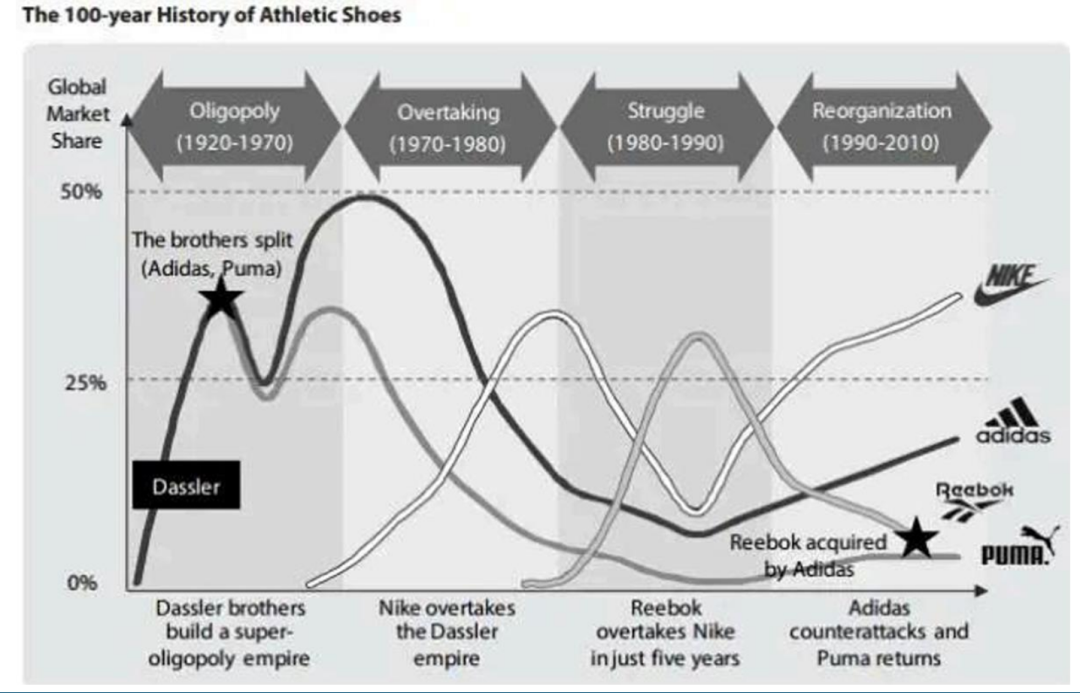 图:1920~2010年美国运动鞋市场主要品牌的更迭及市占率的变化