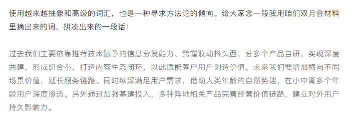 同样是这个话题,关注度更高的还有前两天,张一鸣在字节跳动的9周年年会上引用了一段公司某员工文档里的材料加以批评: